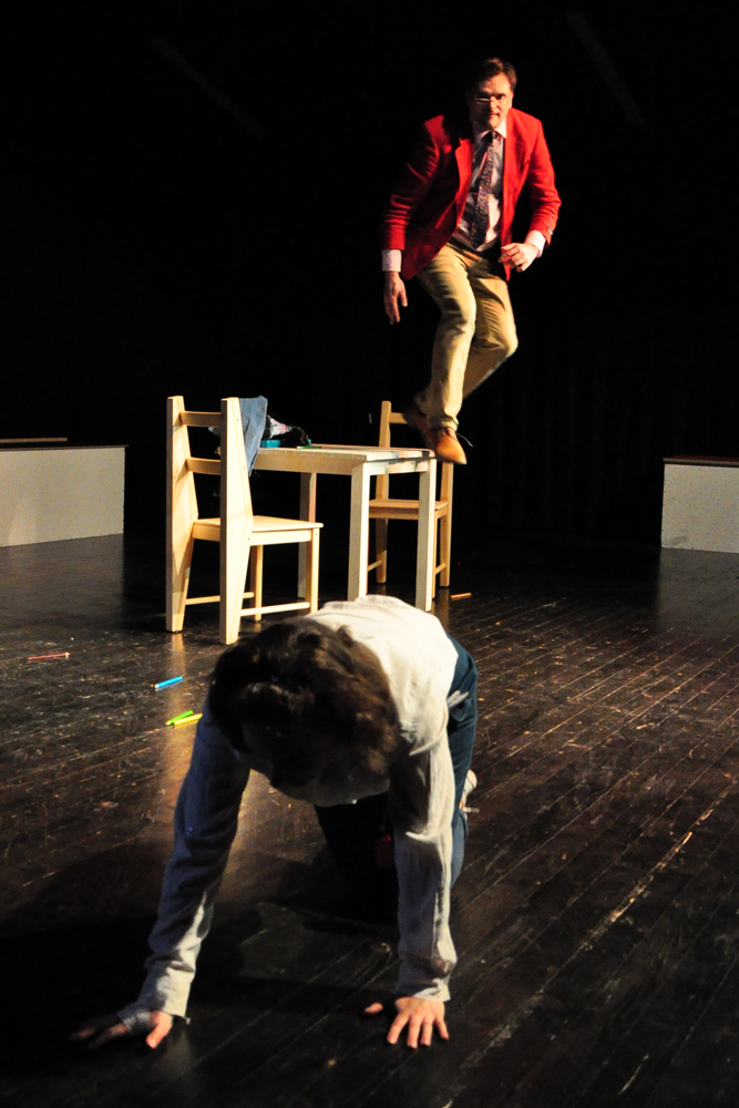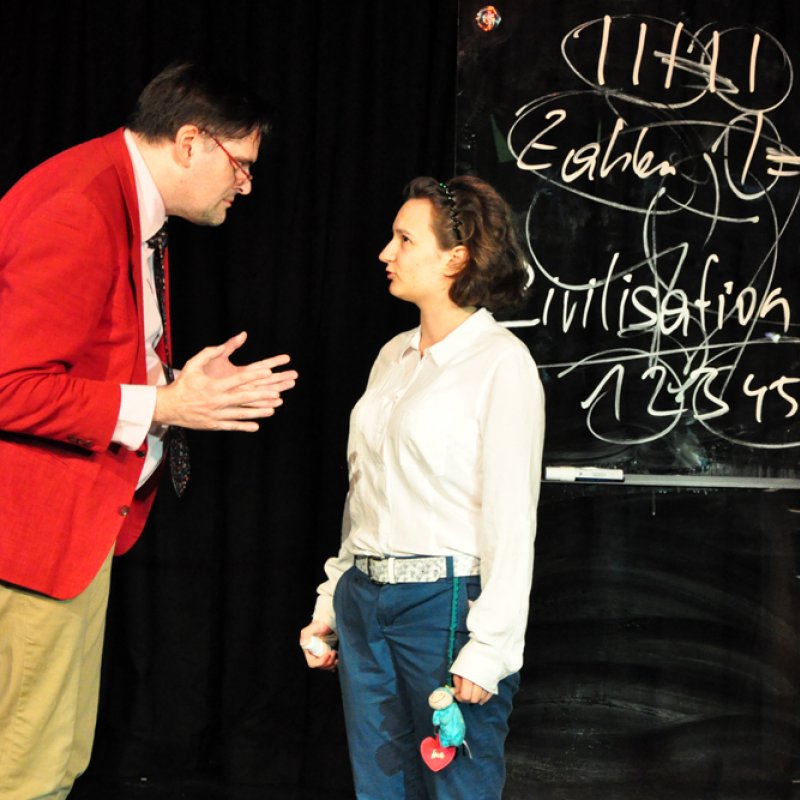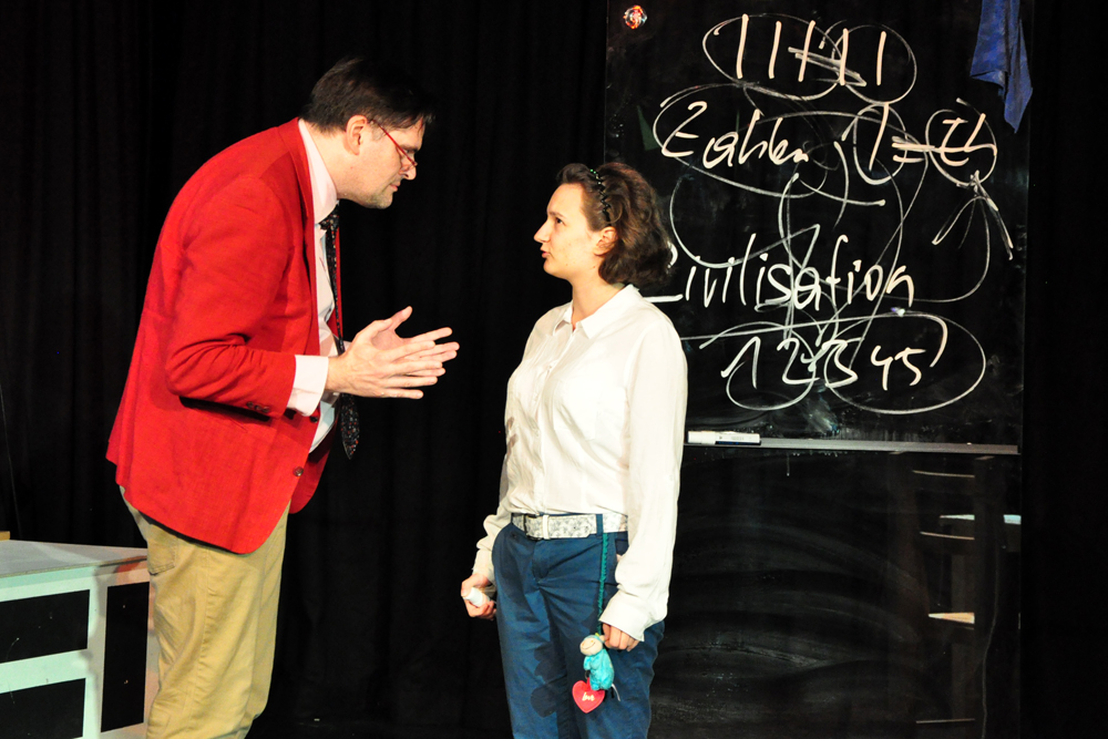 Es ist eine schwer verdauliche Kost, die in der „Unterrichtsstunde" serviert wird. 1951 wurde das Stück des 1909 in Rumänien geborenen, 1994 in Paris gestorbenen Eugène Ionesco, der als bedeutendster französischer Dramatiker der Nachkriegszeit gilt, in Paris uraufgeführt. Die Geschichte klingt recht einfach: Ein Professor versucht, eine dumme, eifrige Privatschülerin zu unterrichten. Sie kann zwar beispielsweise kaum zählen, wohl aber die kompliziertesten Multiplikationen ausführen, da sie ,,sämtliche Ergebnisse, die bei sämtlichen Multiplikationen nur irgendwie möglich sind, auswendig gelernt" hat. Die sprachliche Konvention, die der Professor beherrscht, die Schülerin aber nicht, wird jedoch immer mehr zu einem Verhängnis, verleiht dem Mann Macht, die schließlich mit dem Mord endet. Es ist die Sprache, die zum Werkzeug eines Psychopathen wird und ihn schließlich zum vielfachen Mörder werden lässt.
