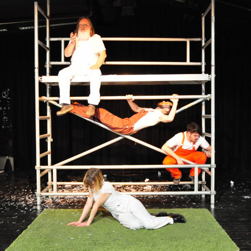 Schreibfaul sind junge Menschen nicht, wie der immense Zustrom an Texten bei der inzwischen 13. ,,dramawerkstatt" in Deutschlandsberg bewies. Drei ausgewählte Stücke punkteten bei den originell moderierten Uraufführungen im Theaterzentrum. Allen voran „Der eigensinnige Hase" von Yvonne Beck. Eine tragische Parabel über Sündenböcke in Krisenzeiten. Mit dem alten Bühnenhasen Sepp Brauchart und einem aberwitzigen, unbequem auf den Verstrebungen eines Baugerüsts liegenden „Faultier" Gerd Wilfing kam unter der Regie von Marco Pessl auch der Spaß im Märchen nicht zu kurz.